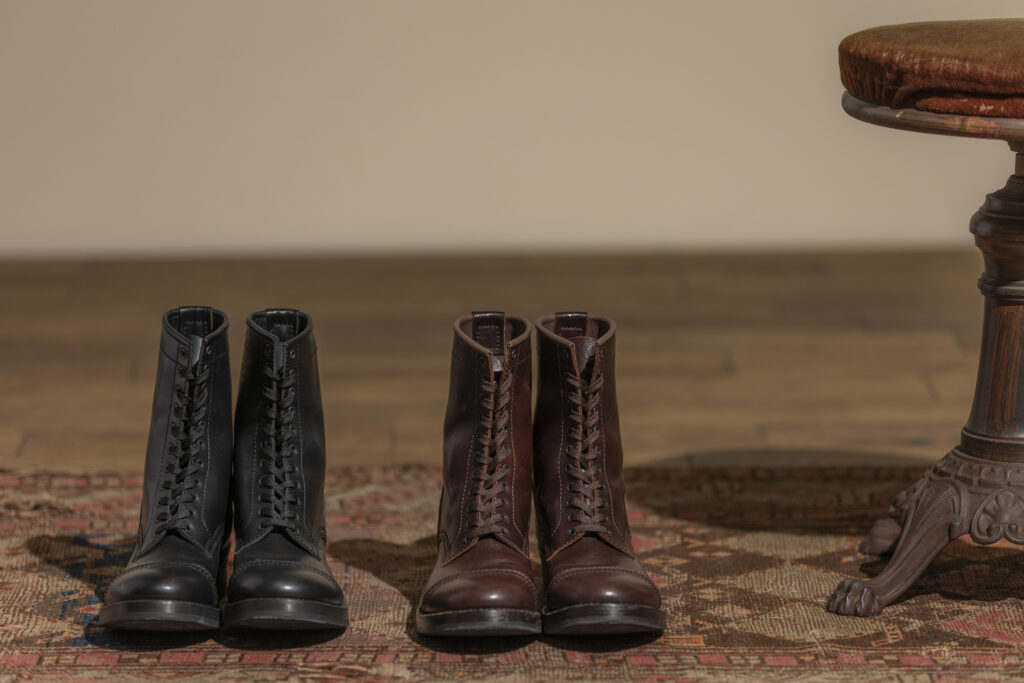 The 8.5-inch high long lace-up boots are now available in a new steer suede finish. Available in black and brown, these boots also come in the two remaining horsehide colors, for a total of four styles.