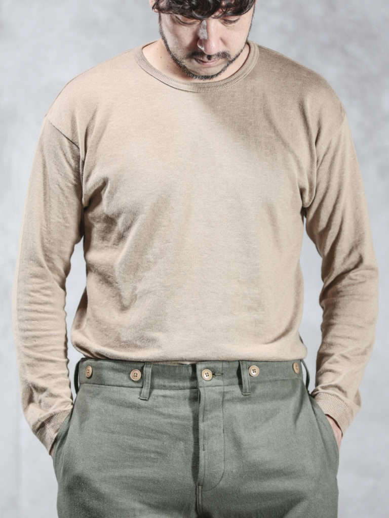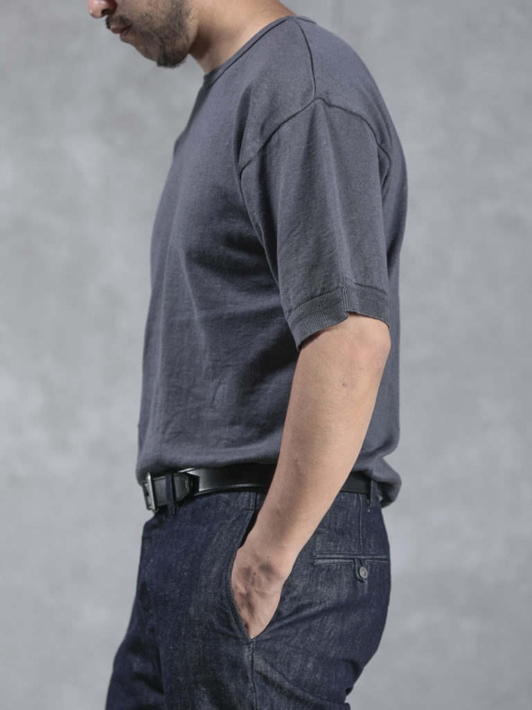 その反面、リネンやラミーはシワになりやすく、肌触りも綿に比べ硬い場合がありますが、今回のニットTeeでは糸の段階で綿にリネンとラミーをブレンドすることにより、