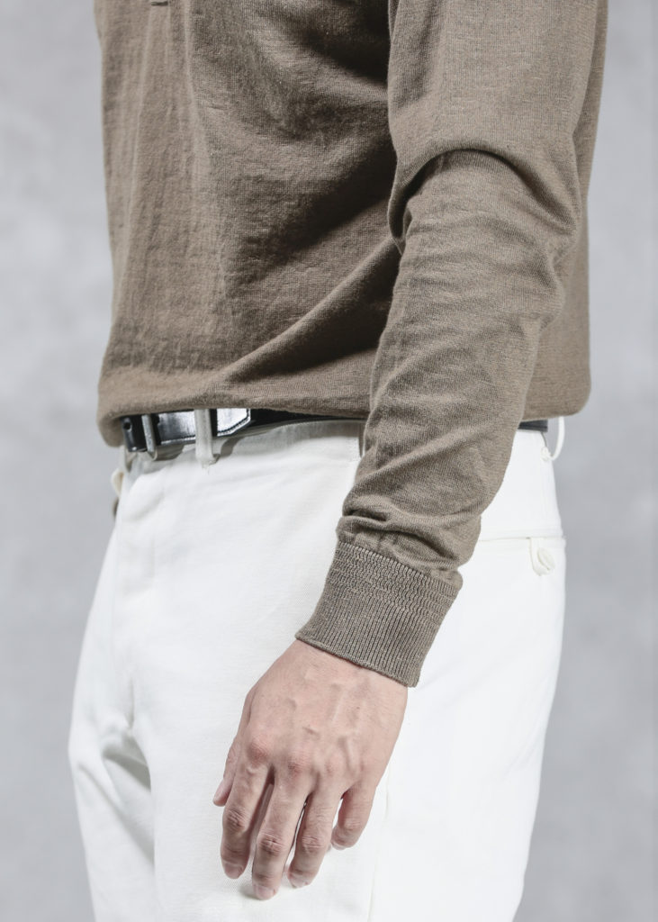 素材の特性を前面に出した製品ですが、脇のガゼットや、ニットだからできる袖口のリブ使いなど、細かいディティールにも抜かりはありません。