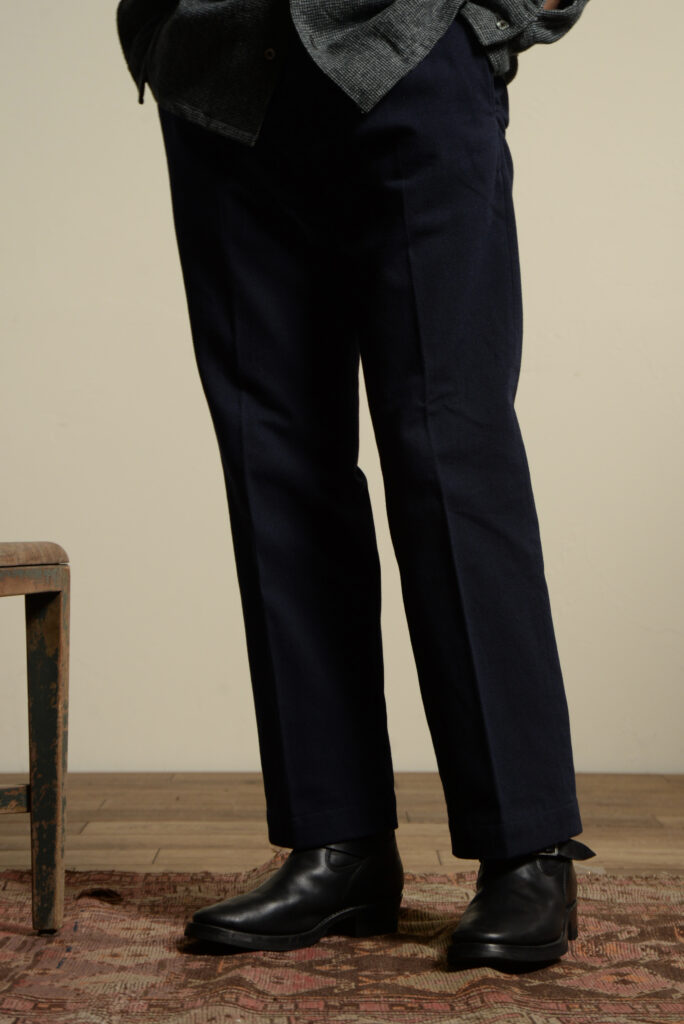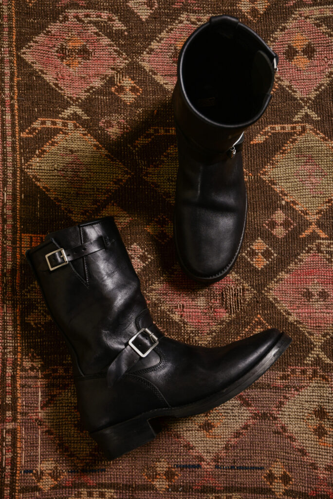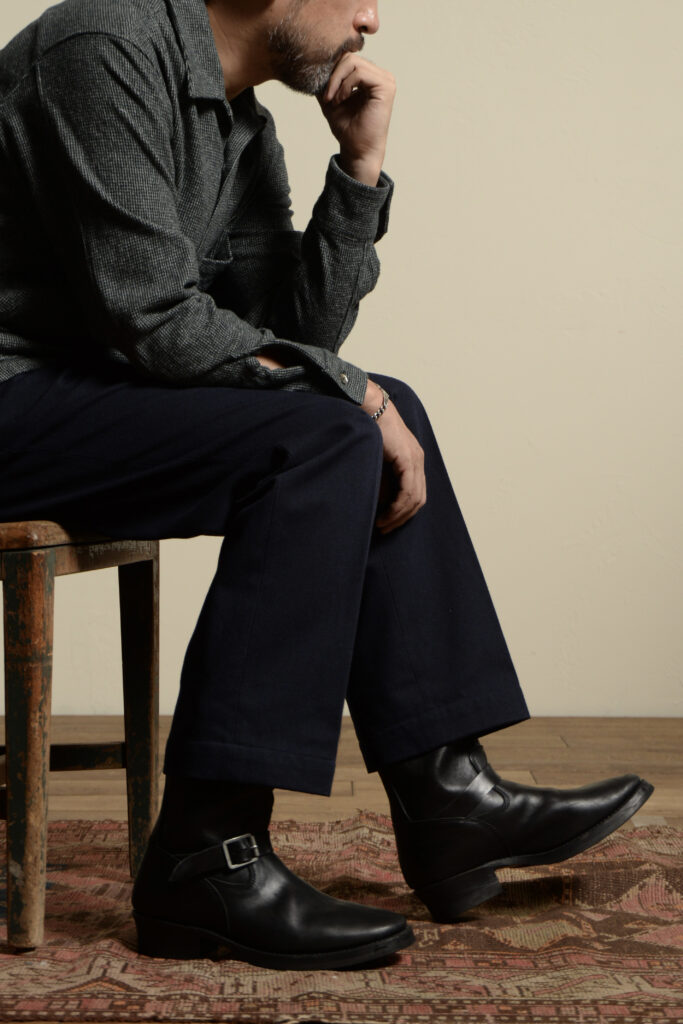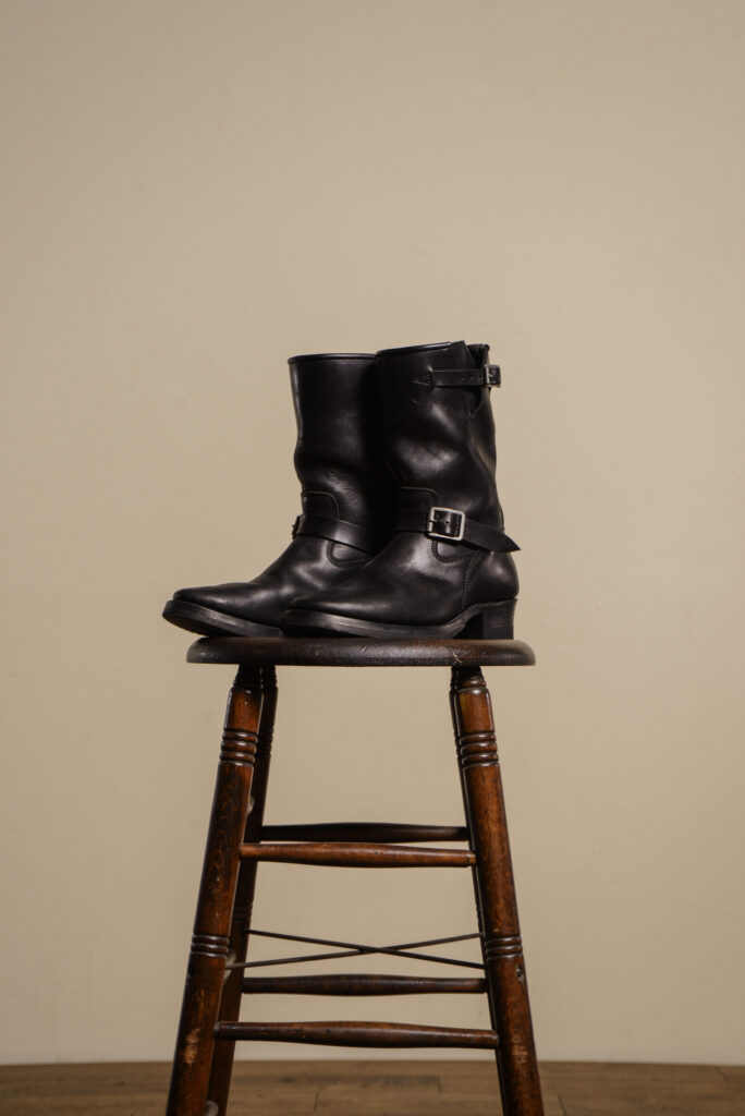 ADDICT BOOTSからはホースバットを使用したCL LASTのエンジニアブーツを、インラインでは茶芯レザーを使用しているのに対し、芯通しのブラックホースバットで作成しました。